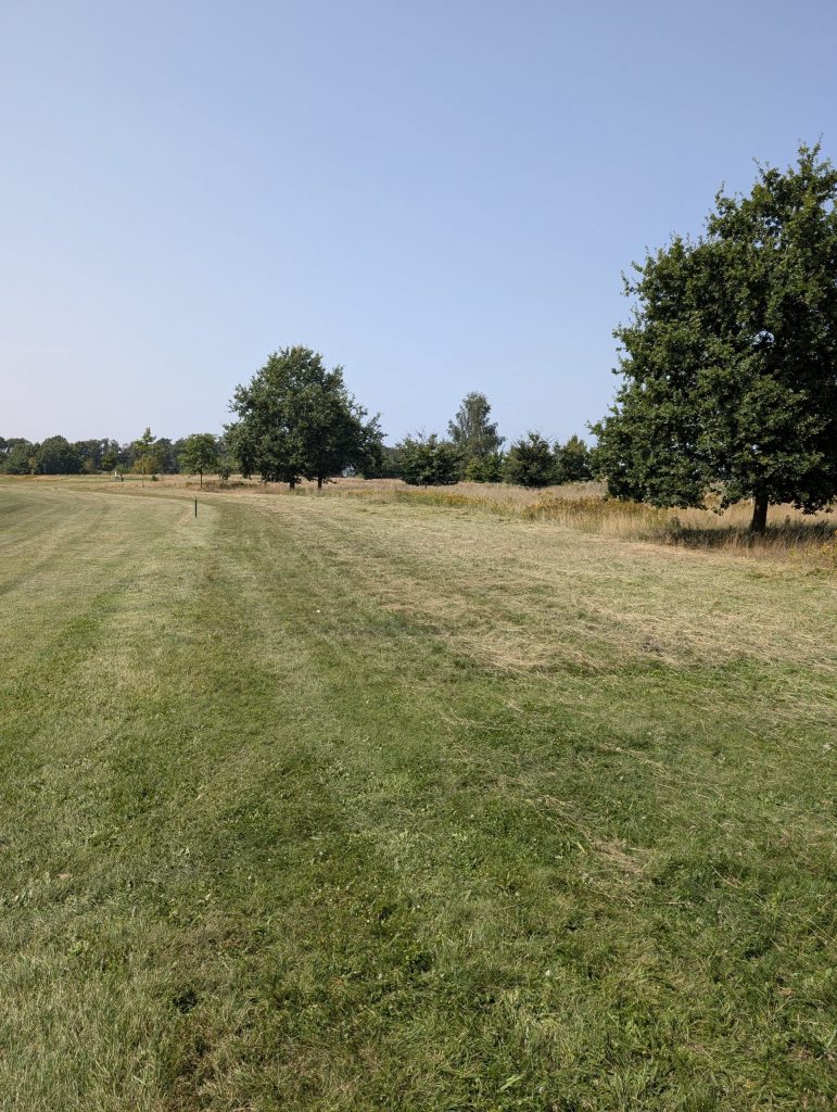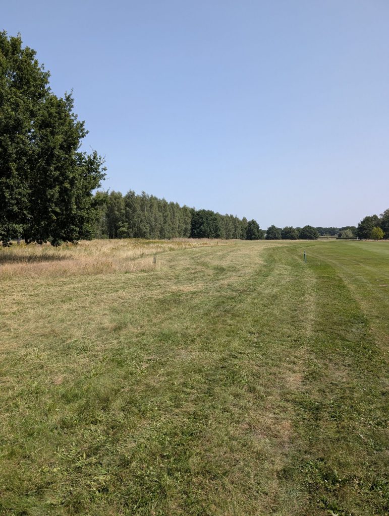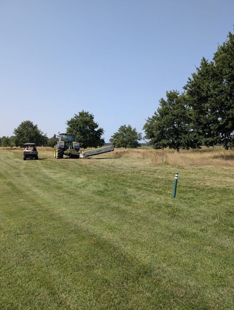 Aufgrund der anhal­tenden Trocken­heit konnte jetzt endlich der von uns beauf­tragte Landwirt das Rough anfangen zu mähen. Gestartet wurde heute ab Tee 10 ff. Das Schnittgut bleibt zunächst auf den gemähten Flächen liegen und wird zeitnah vom Landwirt abtrans­por­tiert. Das Schnittgut wird nachfol­gend im Kuhstall als Unter­streu verwendet und mit Stroh abgedeckt, da es als Futter­ma­te­rial nicht dient (teilweise Jakobs­kreuz­kraut enthalten!). Vielen Dank an unseren Landwirt für die hilfreiche Unter­stüt­zung!